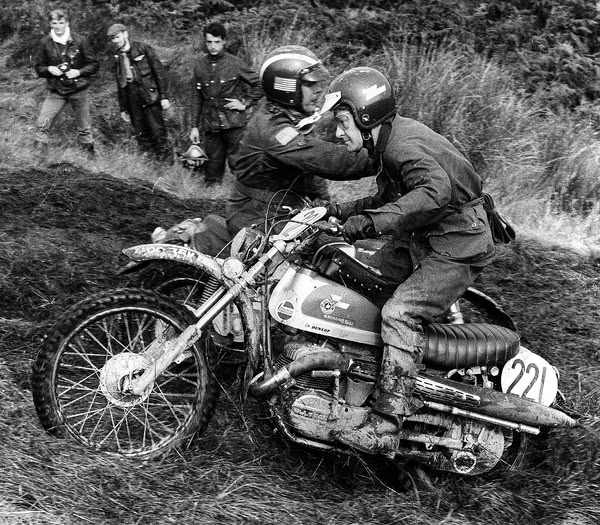 Below is a pic of Sammy Miller in the 1971 ISDT held in the Isle of Man – He is passing a USA rider who looks to have failed a hill climb – Note ! Sammy is on a Bultaco Matador. – we were supposed to go that year also on a Matador, but I broke my leg early in the year – ( reported yesterday on the blog) – I think Turk was on Team Canada that year.
