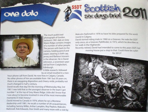Answer to the last quiz – Gordon Jackson on a Greeves – An unusual mount for him as he made his name riding for AJS, and of course made history, by winning the 1961 Scottish Six Day Trial by losing only one point. – here is that famous “Dab’ captured on film by Motorcycle Mag photographer Peter Howdle and marked down by observer Dave Johnston on the left. -As we have reported earlier Johnston later moved to Canada and had a Montesa dealership in Calgary for a time. – He later worked as a rep for a Chain Company but we lost track of him many years ago.