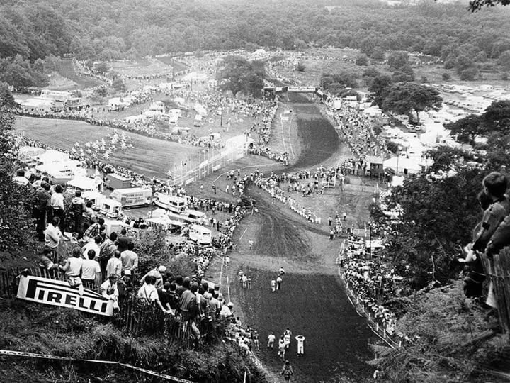 Below is a pic of the famous Hawkstone Park MX Track in Shropshire – the shot is taken from up on the very steep hillclimb – You can see how the long track winds through the flat with a few big sand holes to navigate before the flat out approach to the hill. This was the first ever “Scramble” I went to back in 1955, and as I crossed the track at the bottom of the hill and looked up I thought that nobody would get up that!! – ( There are also some large rock slabs at the top) – Well! later, I saw AJS Factory rider Geoff Ward flying up over the top of that hill – a sight that will remain fixed in my memory. – Unfortunately my day ended badly as somebody “Nicked” my brand new James street bike from the Parking lot!!!!