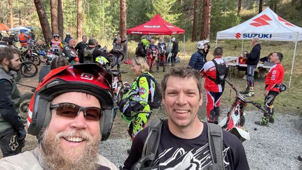 Today we head down to Naramata for the Trial at the new location – it appears they had a good turn out for the first day so I’m looking forward to hearing all about it. It will be an early start -6am out the door. – Colin from Red Deer (in glasses) posted this pic with new guy Geoff who just picked up one of our old Beta Evo 200’s to give Trials a go. – I see Ross in the background in front of the Beta Tent. and Gord Rinke on the right side of the pic. Don Doerksen in Repsol gear.