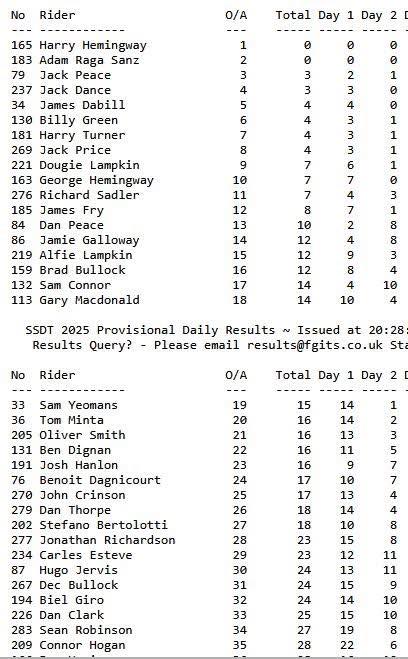 Here are the top scores after Day #2 – notice that the top five riders went “Clean” and also young George Hemingway. – And below a great shot of Harry Hemingway on the Factory Beta – joint leader after two days.