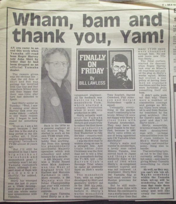 Here is one from the time when Yamaha cancelled John Shirt senior as their dealer – a shock for most Trials enthusiasts as Shirty had been the backbone promoting the TY series along with Mick Andrews. – He then went on to be the Gas Gas Importer and did the same great job along with son John JR – before being cut again this time when KTM bought GG and really took them into the toilet.
