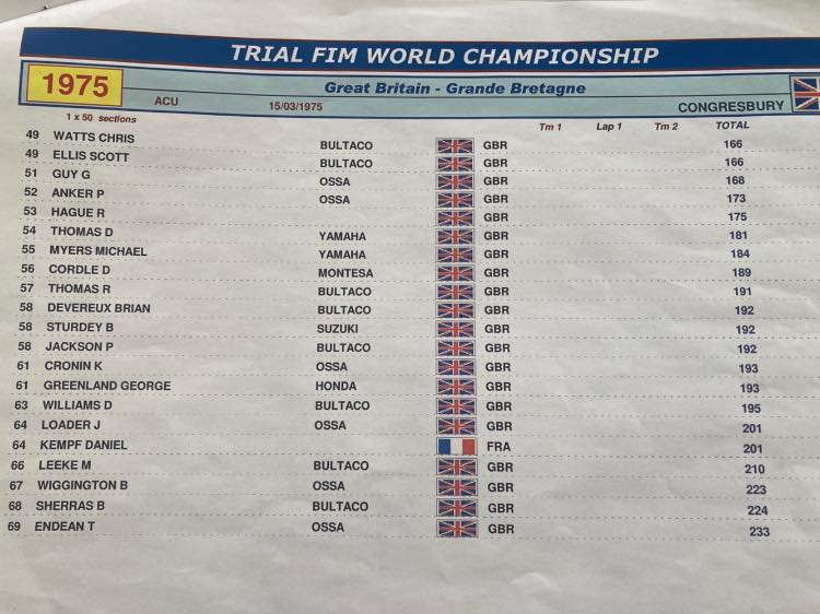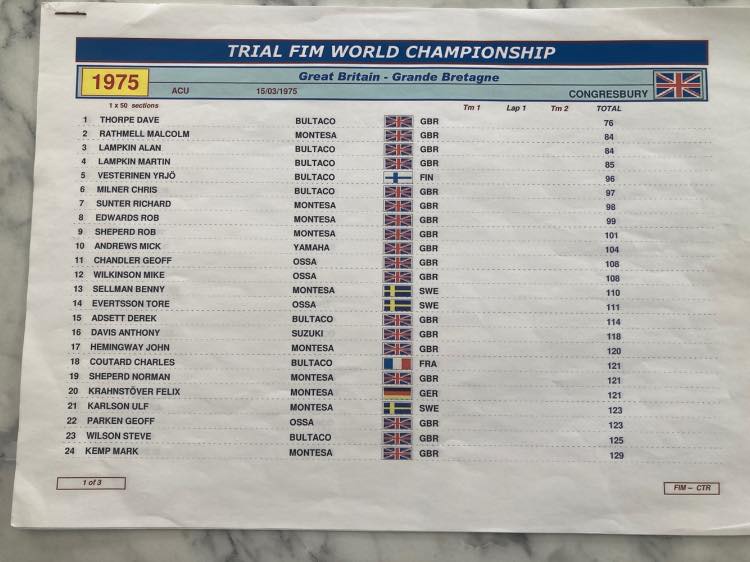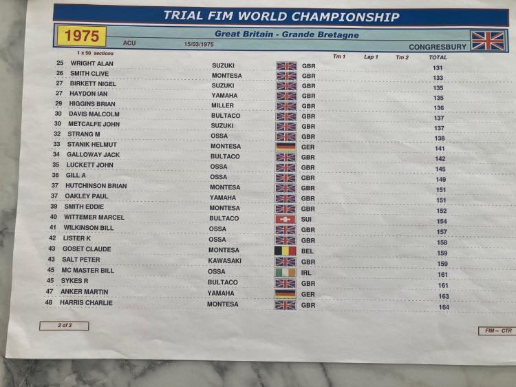 It was in 1975, that the FIM decided to make the European Trials Championship into a “World” Championship – here are the results from that first year in the UK – Just like the one we put on in Alberta, later that year, there were a ton of club riders who went head to head with the top experts of the day. – That is not the case today – just the cost of competing in the series is mind boggling and the circus type acrobatics required to even ride some of the sections, is certainly questionable. – Check out the scores!! Remember back then everybody rode the same line in the sections. ( Still that way at the Scottish Six Day Trial)