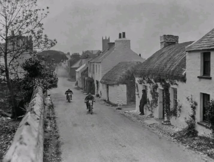 Here is a real TT collector photo – taken back in 1913 – check out the thatched roofs!! – Did you know that the TT races in the Isle of Man originated because they banned racing on public roads in the UK?