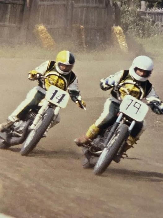 Not Trials – but a great shot of Darryl McCrae and Rick Botting battling it out on the Oval at the Olds AB fairgrounds. – I think I was there that day. – At that time, they were both partners in the shop Forest Lawn Cycle in Calgary. – They were both on Bultaco Astro bikes as I recall.