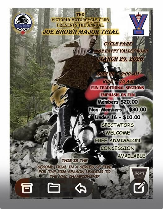 Tomorrow is the VMC Joe Brown Trial at the Victoria club property – Joe was a great guy and former Yamaha dealer, who sold more TY’s than any other dealer in Canada !! – We used to stay with Joe and Carol sometimes when travelling on Vancouver Island. – Another guy who left us too soon.