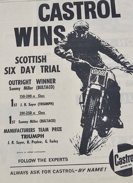 An early Scottish Six Day Trial poster – Sammy Miller as a Castrol sponsored rider. – Did you know that Castrol UK, bought the German Optimol factory many years ago?